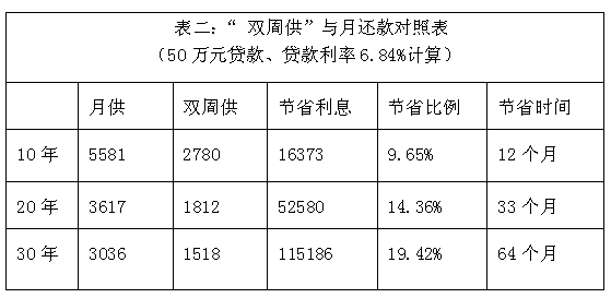 对此,北京信一天房产中介市场部负责人罗煜表示赞同。他解释说,在选定了贷款期限的情况下,采用双周供还款与按月还款法相比,好处很明显,既大大减少利息负担又有效缩短了还款期限。他举例子说,以一笔50万元30年的按揭贷款为例,按基准利率6.12%计算,采用双周供还款可以比按月等额还款法节省利息115186元,节省比例高达19.42%;缩短还款期64个月(近五年半),即30年的月供还款采用双周供,贷款将在24.7年还清。