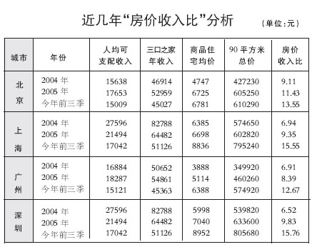 目前国际上公认的“合理的住房价格”的“房价收入比”应该为3至6倍,世界银行专家的说法为4至6倍。也就是说4地的“房价收入比”均高于国际标准的2倍以上。对于“房价收入比”的分析,各方反应不一。有人认为,“房价收入比”不能完全反映房地产市场的现状,每个城市都有自己的特殊情况,例如深圳的白领月收入大约在3000元左右,实际上除去了开销剩下的收入才可视为可用于购房的收入,也就是说个人年可支配收入应该不到3万元,所以“房价收入比”并不能代表有能力购房的人。