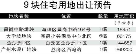 另一幅“巨无霸”住宅地位于金沙洲,面积近15万平方米。金沙洲居住新城位于白云区,是广州2006年土地出让计划的重头之一,也是广州力推建设适合中低收入者房子的重点区域。第3幅住宅用地是位于荔湾区龙溪大道的47073平方米用于商业、仓储的地块(容积率≤0.6)。