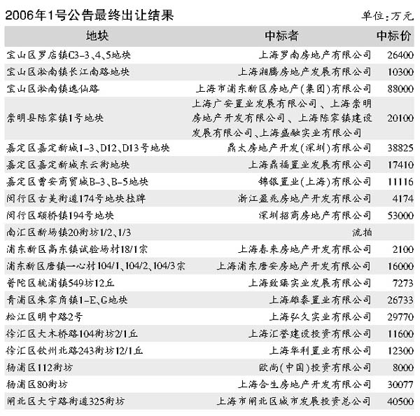 中新网10月20日电 据《每日经济新闻》报道,9月28、29日拍卖的“2006年1号土地出让公告”20幅地块的出让结果19日得到上海市房屋土地资源管理局的确认。除南汇新场镇20街坊1/2、1/3丘流拍,其余19幅土地均找到了“婆家”。