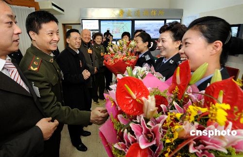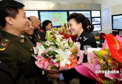 3月8日,国际妇女节,出席十一届全国政协会议的部分文艺界政协委员来到北京人民大会堂交通指挥所,向为两会服务的女交警们献上鲜花,表达节日的祝贺。中新社发 刘英毅 摄