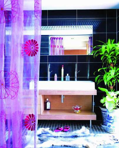富有灵性的紫色是女人们最钟爱的色彩,若隐若现的纱帘隐约而不可捉摸,两者结合构成了家中最迷离的一道风景。试着在浴室干湿过渡区域配上轻盈淡紫色纱幔,既分割区域又让浴室的空气通透舒适。冷调的粉紫色是调情的高手,手工刺绣的雏菊图案在紫纱上若隐若现,给沉闷的卫浴带来遐想,沉醉在这明艳的色调中,享受全身心的放松吧!来点绿植,大片的绿叶丰富了黑色瓷砖的层次,给浴室带来了无限的生机。