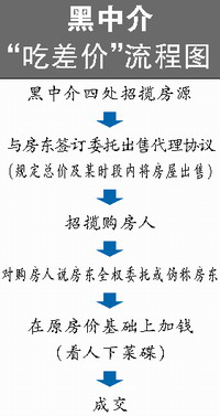 中新网9月13日电 二手房价正在水涨船高。《北京娱乐信报》记者采访发现,除正常因素上涨之外,一些不法中介采取“吃差价”方式,正在成为扰乱二手房市场的“黑手”,与此同时,一些房东也间接地助长了黑中介“吃差价”的恶习。