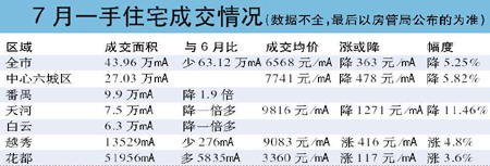 根据阳光家缘数据,今年7月广州市一手住宅网签面积为43.96万平方米,比6月份减少了63.12万平方米,下降幅度达到143.5%;7月份成交套数为3859套,比6月份减少了近2000套;中心六区网签面积27.03万平方米,虽然7月份是传统的淡季,但是出现成交量降幅如此之大还是近年来少有的。