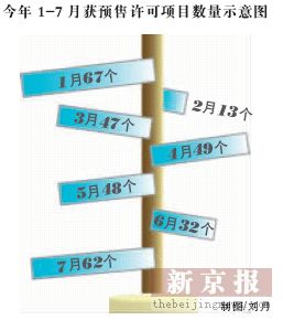 中新网8月8日电 据《新京报》报道,据北京市房地产交易管理网数据显示,7月北京获批预售许可项目62个,比6月32个增长了近一倍,这一数量仅次于1月获预售项目数。