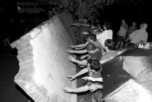 中新网8月2日电 据《京华时报》报道,1日晚7点半,50多名北京方舟苑小区一、二期业主冒雨聚集在小区四号楼下,大家一起锤砸手推,用两个多小时的时间,推翻了挡在小区一、二期和三期楼盘之间的一段近百米长的围墙。由于小区分归两个物业公司管理,这段区分管理区域的围墙长时间影响着小区居民的生活。