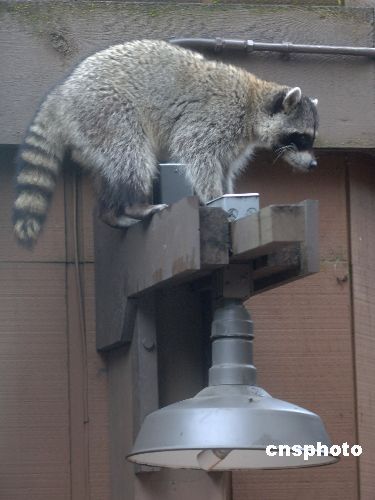 美国今夏六月出现四百年来罕见的气温升高现象,北加州一只狸猫走出森林,爬上动物保护区里一座餐厅的灯柱上,寻找食物和饮水。中新社发 贾国荣 摄