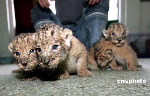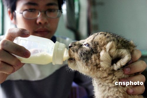 7月16日,福州动物园出生仅8天的4只幼狮开始学习走路。虽然它们步履蹒跚,但是模样活泼可爱,能吃又能睡,长得还挺壮实,最大一只体重长到2公斤。 据饲养员介绍,7月8日,动物园里的母狮一胎生下一雌三雄幼狮,不料产后出血,身体欠佳,无法哺育宝宝。动物园决定,4只幼狮采取人工喂养。中新社发 杨婀娜 摄