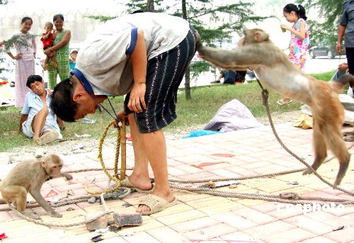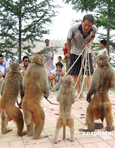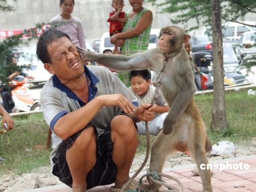 7月20日下午,在江苏徐州著名景区汉城门口,一名卖艺耍猴者在耍猴时惹怒众猴,遭到众猴拳打脚踢。中新社发 蔡广银 摄