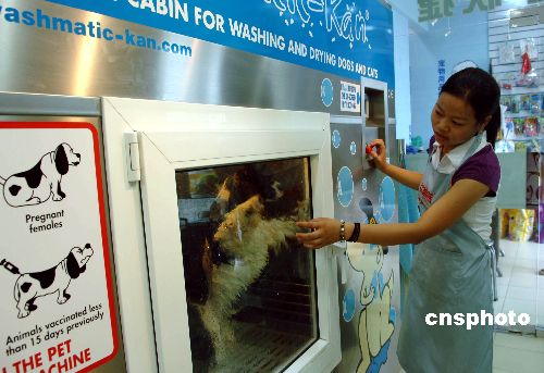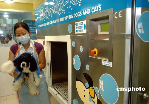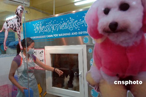 7月21日,在江苏省无锡市永和路一家宠物美容中心,工作人员将一条洗完澡的美卡犬从宠物洗澡机中抱出。据了解,这种洗澡机集清洁、除菌、干燥、加香、护理等功能为一体,可以为家养的猫狗等宠物方便、彻底地洗澡。中新社发 潘正光 摄