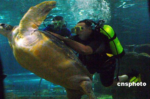 2006年7月22日,两位游客在河北秦皇岛新澳海底世界与百岁老龟一起畅游,享受清凉周末。据悉,当日该市迎来入夏后最高气温30℃。中新社发 李佳明 摄