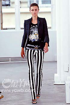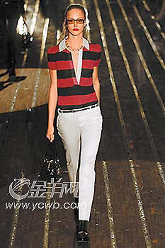 在Gucci今季以扬帆出海为主题的日间装扮中,可以见到一条简洁清爽的白色铅笔裤贯穿始终,上身的海军蓝、白色及红色条纹T恤,则用性感的低V设计来吸引人,腰带细得若有若无,脚上是耀眼的金色高跟鳄鱼皮鞋,既给人较中性化的感觉,又不失女性的韵味。要帅又要不失性感,实际上,这就是新帅男孩的最佳尺度。