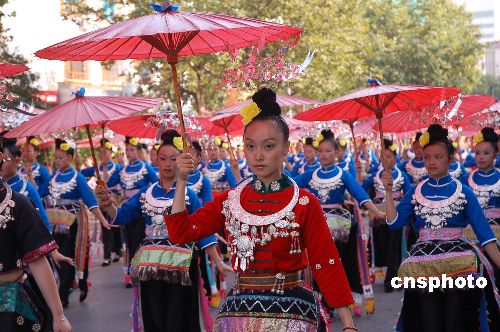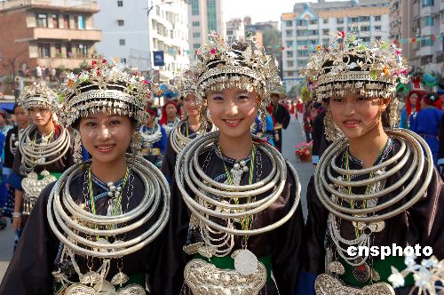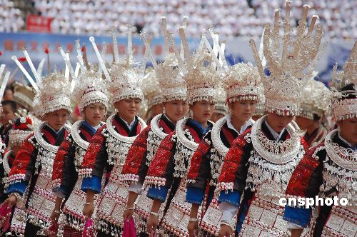 7月23日,贵州省黔东南苗族侗族自治州建州50周年庆祝活动中,当地苗族、侗族等各少数民族同胞身着华丽盛装,成为一道亮丽的风景。中新社发 吴如雄 摄