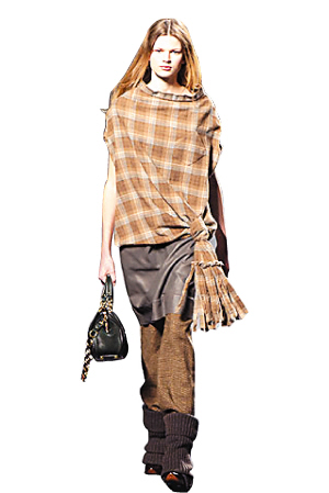 Marc Jacobs将上季俏丽的军乐队和青春女高校生形象放下,取而代之的是大量用法兰绒包裹的层迭彩格披肩,就好似流浪在各个世界角落的街头表演艺术家穿着:过大的棉织衫、宽松长裤、暖腿裹套、甚至是将厚重的宽裙随意绑在身上,制造出随意却风格独具的街头时尚。