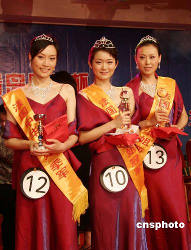 当地时间6月25日,“青岛啤酒杯2006中华小姐环球法国大赛”在巴黎新世界中国城进行决赛,三名佳丽从参加决赛的14人中脱颖而出,徐小烨(中)、李佳(右)、谢小可分获冠亚季军。其中冠亚军还将代表法国参加在法兰克福举办的中华小姐欧洲赛区的比赛。中新社发 钟诚 摄