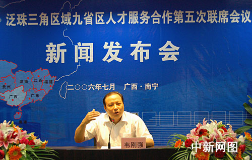 广西壮族自治区人事厅副厅长韦刚强在今天举行的新闻发布会上介绍,泛珠三角区域九省区人才服务合作联席会议是贯彻落实《泛珠三角区域合作框架协议》精神,由泛珠三角区域九省区(福建、江西、湖南、广东、广西、海南、四川、贵州、云南)政府人事部门所属人才服务机构协商一致,自愿组成的人才服务合作的组织协调机构。联席会议于二○○四年七月正式启动以来,已先后在广东、云南、湖南、江西四省举办过四次联席会议。