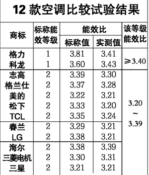 在满足上述条件下,按公式计算(能效比=制冷量/输入功率),实测能效比应大于等于能效限定值的86%。比如格力,其标注能效比为3.81,格力达到3.28就符合国家规定,如果标注一级,至少要达到3.40,而格力的实测值为3.41。从这一标准判断,格力合格。