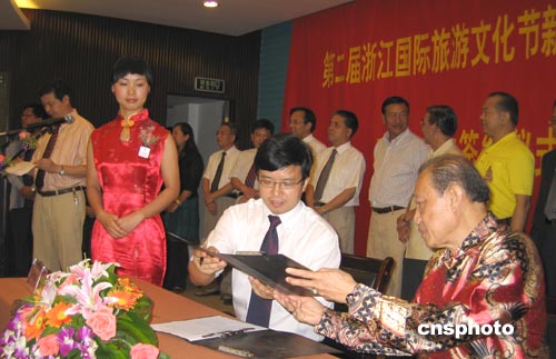 随后,第二届浙江省国际旅游文化节新昌分会场友好合作签约仪式开始,在欢快的气氛中,泰国沙旺亚隆市市长朴哇啦、泰国艾亚兰古象王国总经理谭凯娉女士、浙江省海峡旅行社总经理翁杰先生、省金桥国旅副总吴惠萍、省港中旅亚太部经理分别与新昌县人民政府、新昌县旅游局签订旅游友好合作协议。签约仪式在泰国舞蹈家优美而充满异国风情的舞姿中结束。