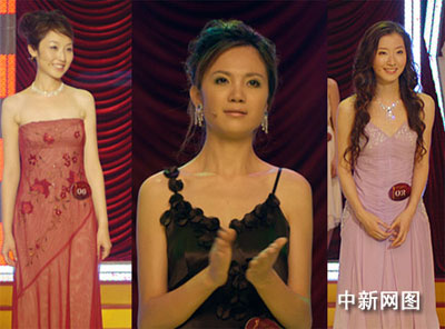晋级2006中华小姐环球大赛的C组选手刘亚维(中)及D组选手阿娜尔、黄橙子 评委(左起)李纯恩、蓝天、梁文。(凤凰卫视供稿)