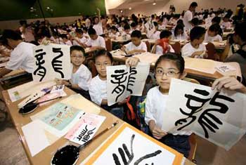 中新网7月4日电 据香港大公报报道,为庆祝香港回归祖国十周年,中华文化促进中心昨天举行“龙的传人”──万龙情系庆回归。逾千名港澳及内地学生即席挥毫,书写不同书体的“龙”字,表达这班“龙的传人”对特区成立十周年的祝福。