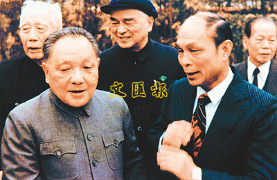 1992年邓小平南巡时,霍英东向邓小平介绍情况,梁灵光(后排中)陪同。(资料图;香港文汇报)