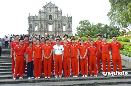 八月二十二日,来澳门参加世界女排大奖赛的中国女排全体运动员游览大三巴牌坊并合影留念。中新社发 史利 摄