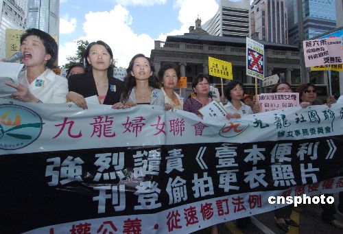 8月29日,香港妇女权益联盟由遮打花园游行到政府总部,向政府反映不满不良传媒的诉求, 强烈谴责不良刊物偷拍香港艺人钟欣桐(阿娇)换衣事件,促请政府加 强执法监管。中新社发 王丽南 摄