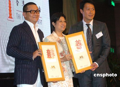 香港著名作曲家雷颂德(左)、公益金董事、演艺明星黎明先生9月1日晚接受香港公益金会会长曾鲍笑薇女士颁发公益金荣誉奖。当晚,香港公益金2005/2006年度周年颁奖典礼在香港会展中心隆重举行。据介绍,该年度共筹款二亿二千五百万港元,创下1998年来最优秀的成绩。中新社发 王丽南 摄