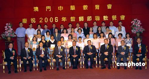 9月9日晚,澳门中华教育会在澳门万豪轩酒家举行庆祝2006年教师节联欢宴会。澳门特别行政区行政长官何厚铧向教师们祝贺节日。国务院侨办副主任赵阳来澳向澳门中小学和图书馆赠送“三常”丛书。图为受表彰的教师与嘉宾合影。中新社发 史利 摄