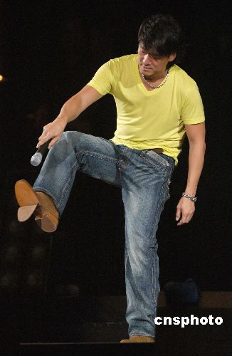 9月19日晚,歌星周华健在香港红馆举行《BLITA百利达华健20周年香港演唱会2006》,周华健阔别十年再次踏上香港红馆舞台,在演唱会上发生一段小插曲,周华健于舞台上走动时,发觉穿着的鞋底也半脱落状态。中新社发 邓庆乐 摄