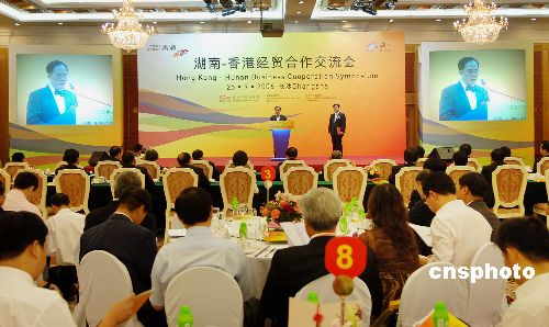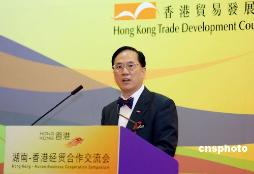9月25日上午,“湖南-香港经贸合作交流会”在长沙开幕,香港特区行政长官曾荫权致辞。香港工商及科技局局长王永平、行政长官办公室主任曾俊华等港府官员和商界领袖,与湖南当地相关人士三百多人出席开幕式。中新社发 肖前辉 摄