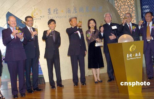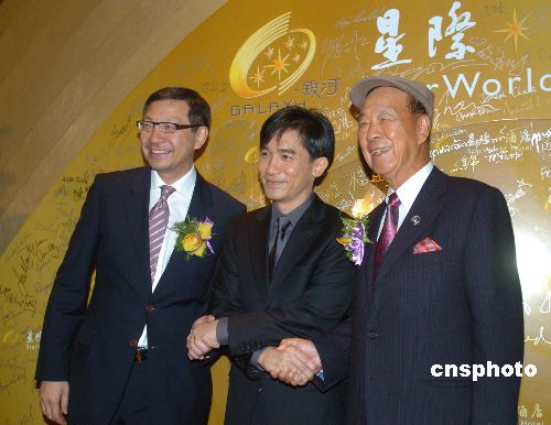 十月十九日晚,影帝梁朝伟先生在澳门银河星际酒店及娱乐场开幕仪式上,右手拉着银河集团主席吕志和,左手拉着银河集团副主席吕耀东,祝贺银河星际酒店及娱乐场开业。中新社发 史利 摄