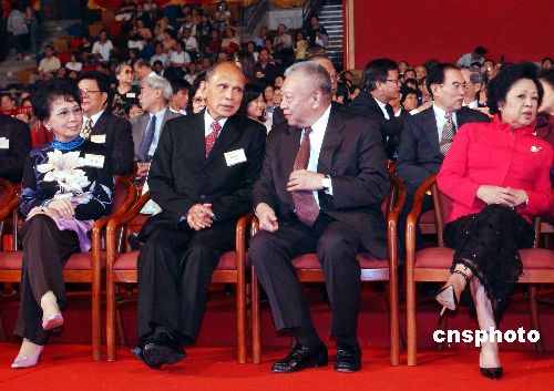 全国政协副主席霍英东28日晚七时许病逝于北京协和医院,终年八十三岁。图为霍英东“左二”与前特首董建华出席公开活动时的资料图片。中新社发 洪少葵 摄
