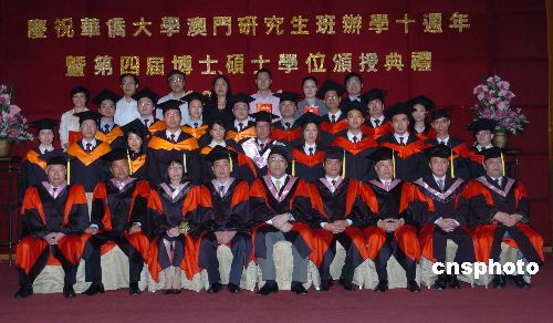 十一月一日,庆祝华侨大学澳门研究生办学十周年暨第四届博士、硕士学位颁受典礼在澳门万豪轩酒店举行。澳门特区政府社会文化司司长崔世安出席颁受典礼并与颁受证书的博士、硕士生们合影。华侨大学成立四十六年来,为澳门培养了大批优秀人才。 中新社发 史利 摄