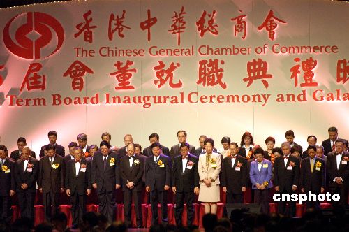 香港中华总商会第45届会董就职典礼联欢晚会11月3日晚在香港会议展览中心举行﹐晚会开始前﹐全体人员起立向基金会永远主席及赞助人﹑已逝的霍英东先生哀默哀一分钟﹐表达哀思。中新社发 王丽南 摄