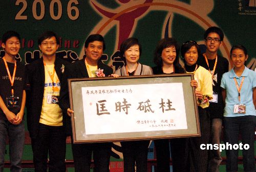 11月6日,香港两千多学生聚集湾仔伊丽莎白体育馆参加《明日领袖高峰论坛2006-献出我本领》活动,分享香港各界杰出青年的人生事业心得。图为论坛向廉政公署专员罗范椒芬女士(右5)赠送励志扁牌。中新社发 王丽南 摄