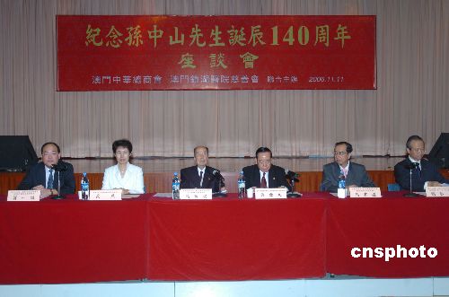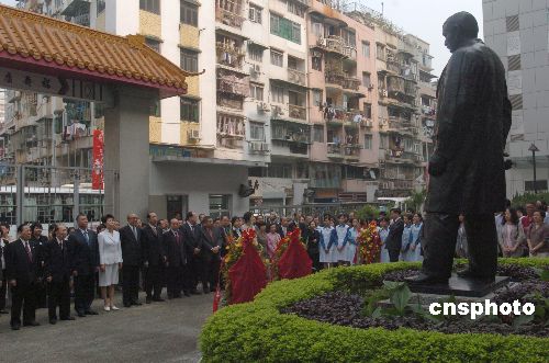 十一月十一日,澳门各界人士在澳门镜湖医院向孙中山先生铜像敬献花篮,纪念孙中山先生诞辰140 周年,澳门特首何厚铧出席纪念活动。在随后举行的座谈会上,全国政协副主席、澳门中华总商会会长马万祺致词。 中新社发 史利 摄