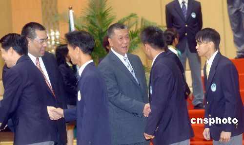 十一月十四日,澳门特首何厚铧在澳门东亚运体育馆为即将出征的第十五届亚运会澳门代表团运动员送行。祝澳门运动员屡创佳绩,为澳争光。中新社发 史利 摄