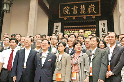 在进入书院头门之后,曾荫权及香港团听取了湖南省发展改革委员会主任黄志军的省情介绍。随后,在始建于宋代的书院中门前,曾荫权特别作停留,与随行人员一起留影。这里,悬著书院最著名的“惟楚有材,于斯为盛”牌匾。