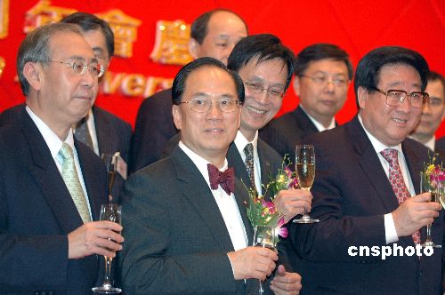 7月10日,香港特首曾荫权(右二)、中央驻港联络办公室主任高祀仁(左一)、香港政务司司长许仕仁(右一)等出席香港民建联成立十四周年会庆酒会。中新社发 蔡蔓莉 摄
