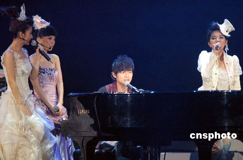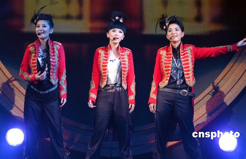 台湾乐坛人气组合S.H.E,7月13日晚在香港红馆举行“S.H.E移动城堡世界巡回演唱会PERFECT 3”。S.H.E三位成员任家萱(Selina)、田馥甄(Hebe)、陈嘉桦(Elle)在演唱会落力演出。中新社发 邓庆乐 摄