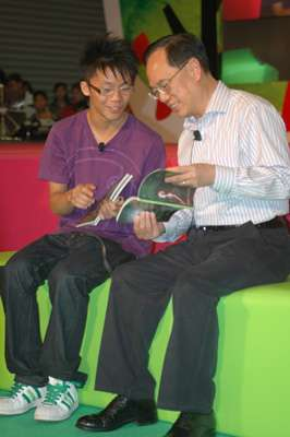 获香港科技大学破格取录入读电子工程学士课程的中五毕业生陈易希,十九日于书展上与香港特首曾荫权对话,并向特首介绍其新书《摘星少年 陈易希》。