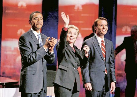 希拉里(中)和奥巴马周二在内华达州出席民主党辩论会时同台亮相