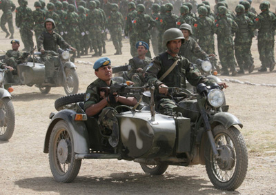 同时进行机动合围的,还有乘坐步战车和装甲车前进的中方突击队。根据双方协商,步战车和装甲车是由塔方向中方提供的。“这些重型装备差不多已经使用40年了,火力点位置也跟我们的装备不一样。”中方加强特战连王军贤中校说,“这是此次演习我们在训练中最大的难点。”塔反恐分队和中方突击队同时乘坐摩托车向人质点机动,速度快得几乎要飞起来的摩托车队在两个方向划出两道白烟,这清楚地显示,双方部队对恐怖分子形成了前堵后截的局势。