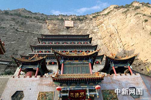 雄伟壮丽的大罗宫,两侧是神秘奇险的白云洞和白云庵。白云洞位于大罗宫北侧,百米崖壁上有一洞口,柴扉半启,是资深高道闭关辟谷之所。这里,阴雨前常有白云飘出,故称白云洞。清代乾隆年间介休名士王佑曾赋“深山多白云,洞在云深处,竟日寂无人,白云自来去”的诗句,道出了这一景观的奇妙和独特。白云庵深藏于百米悬崖上一天然石洞中,内有释迦牟尼和文殊、普贤塑像,为宋代风格。塑像身后有6块0.6平方米的石板,上面刻有《金刚经》经文,虽年深日久,但保存基本完好。在此原无径可寻的悬崖绝壁之上造像、勒石,其难度之大可想而知。古人那种不畏艰险的执著追求,不禁使人叹服!现在已筑起了悬空通道,供游客观赏此庵。