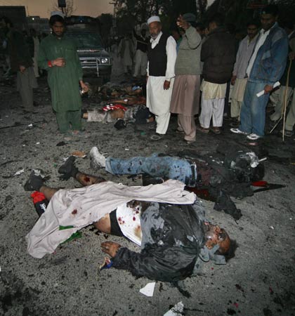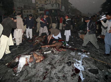 中新网12月27日电 据路透社报道,巴基斯坦前总理贝-布托今日在竞选集会上遭到炸弹袭击,不治身亡。图为爆炸现场。(关新)