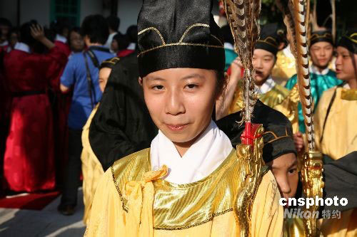 十月五日举行的台北祭孔大典上,大龙小学的佾生伴着乐曲起舞,要完成九十六个舞蹈动作,佾生们要练一年以上并写出动作记录才能记住,因此被戏称为大龙小学的“秘笈”。图为可爱的小佾生。中新社发 杨旭 摄