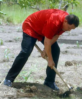中新网8月7日电 委内瑞拉总统查韦斯在8月6日的一档电视节目中拿着锄头在田地中干农活。