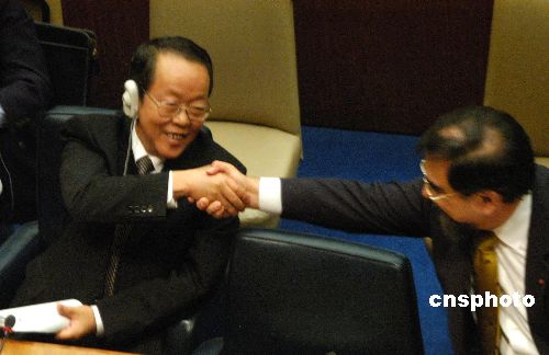 美国当地时间九月十二日,第六十一届联大总务委员会举行首次会议,一致决定拒绝将所谓“台湾在联合国代表权”等提案列入本届联大议程。这是自一九九三年以来,联大总务委员会连续第十四次明确拒绝所谓“台湾参与案”。图为智利大使向中国常驻联合国代表王光亚表示祝贺。中新社发 谭宏伟 摄