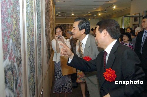 由中国国际文化交流中心、中国西泠印社和香港各界文化促进会共同主办的《萧晖荣中国画展》于9月1日上午在东京都日中友好会馆美术馆举行了开幕式。中国驻日本特命全权大使王毅、中华全国归国华侨联合会顾问、中国国际文化交流中心副理事长林丽韫、日本皇室成员、昭和天皇外孙东久迩信彦、日中友好会馆理事长村上立躬等日本政界、文化界的多名友好人士出席了开幕式。图为王毅大使仔细观看画展。中新社发 滕剑峰 摄